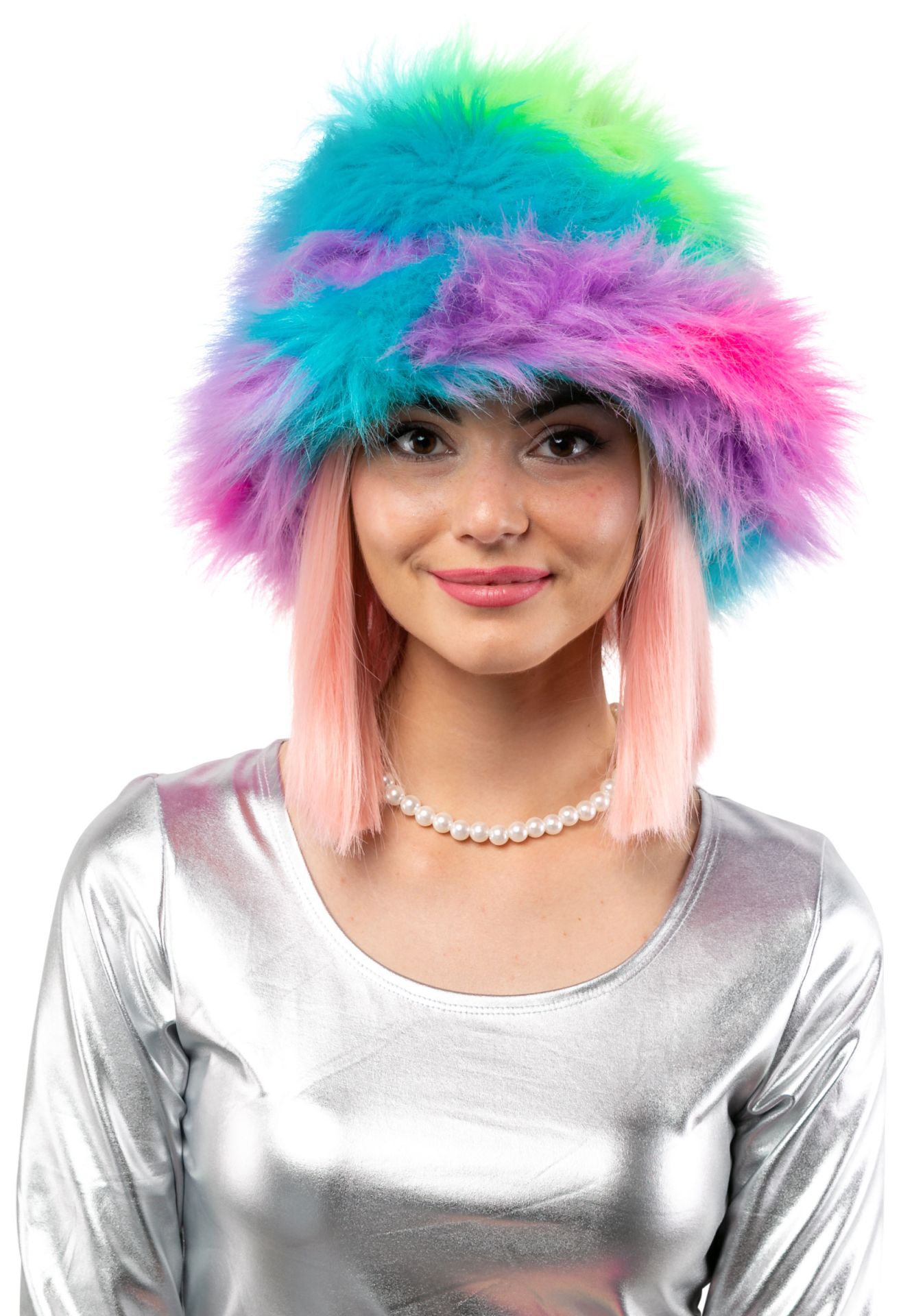 Lieferumfang: bunter Fischerhut aus Plüsch mit langem Flor